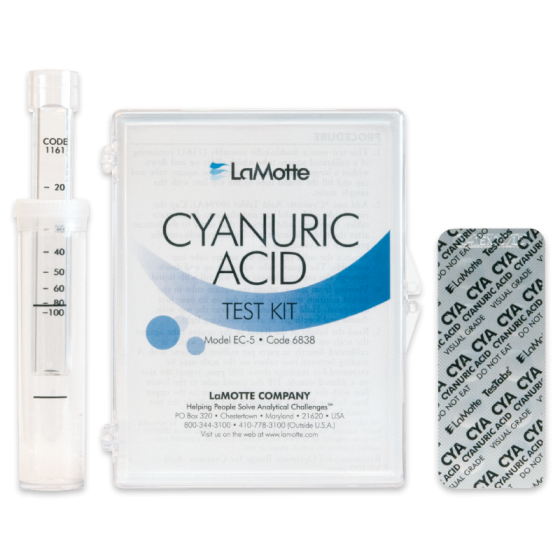 The Cyanuric Acid (Stabilizer) test kit measures Cyanuric Acid levels at 20, 30, 40, 50, 60, 80 and 100 ppm. The kit includes 50 Cyanuric Acid visual grade TesTabs® tablets that are added to a test tube. Test is performed using the look-down technique and disappearing dot method.